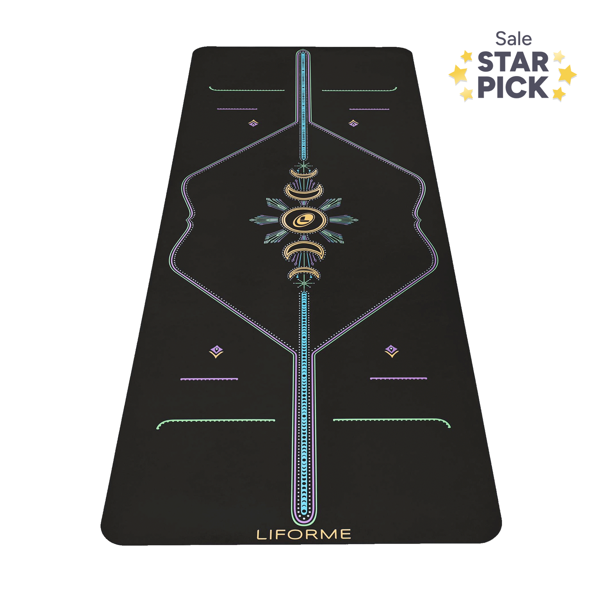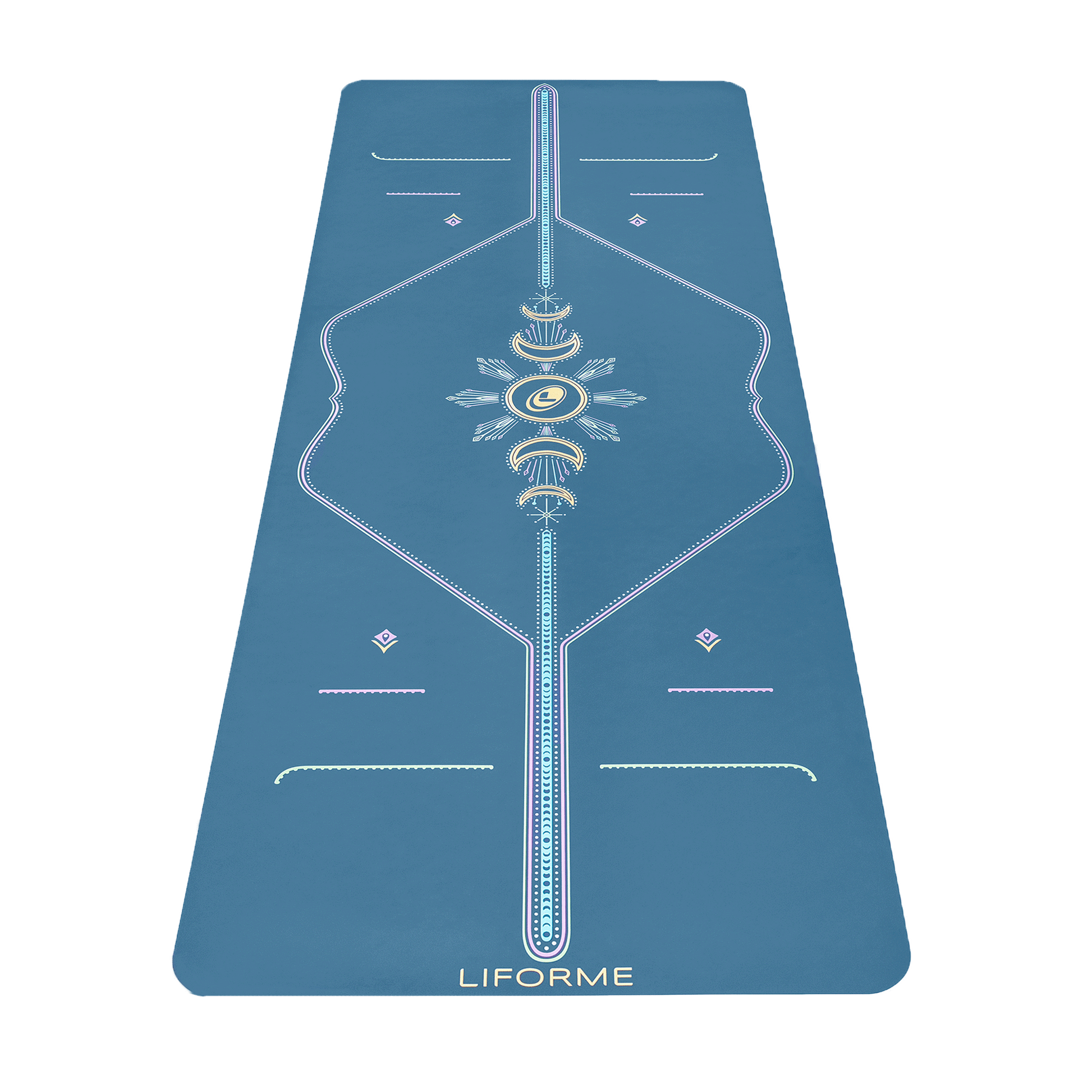 TRULY LUMINOUS. The Cosmic Moon Yoga Mat features a radiant moon AlignForMe® posture alignment design, in beautiful shades of yellow, blue, green, lilac, and white on our super-grippy mat surface. Inspired by the celestial energy of the lunar cycle, this visually stunning Yoga mat is designed to support your physical and spiritual transformation.